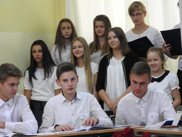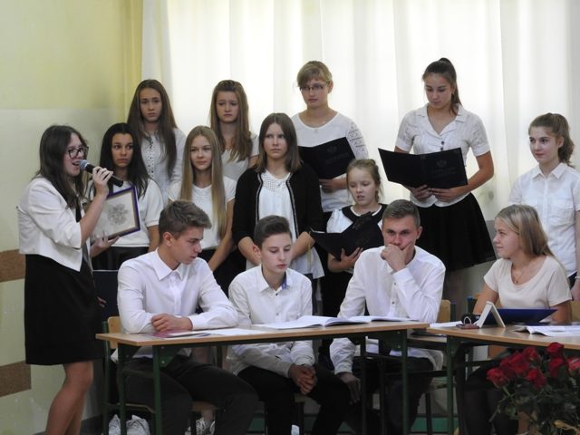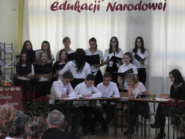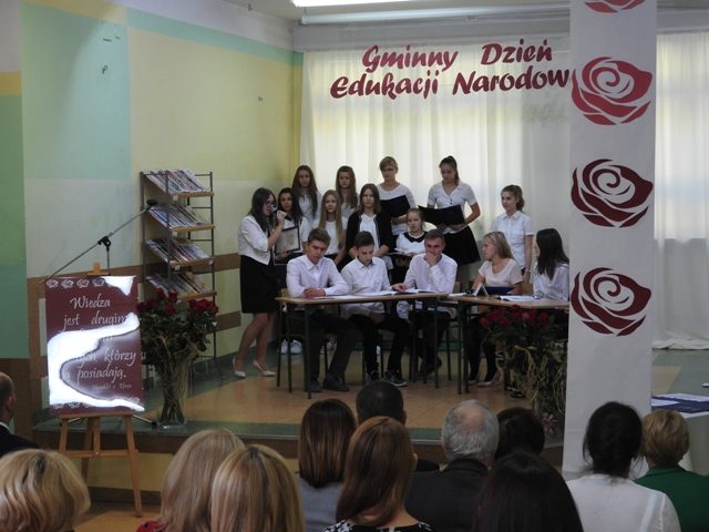 Uroczystość rozpoczęła pani Dyrektor Agnieszka Szczypek, która serdecznie przywitała przybyłych i zaprosiła do obejrzenia programu artystycznego, przygotowanego na tę okazję przez uczniów klas III gimnazjum pod czujnym okiem pań Małgorzaty Gałązki i Niny Borkowskiej. Uczniowie w humorystyczny sposób przedstawili uroki pracy nauczyciela we współczesnej szkole. Aplauz wśród publiczności wywołał występ szkolnego chóru.