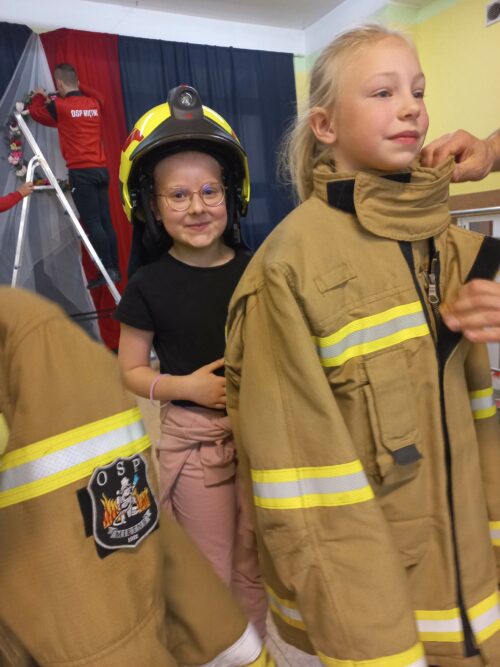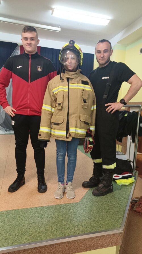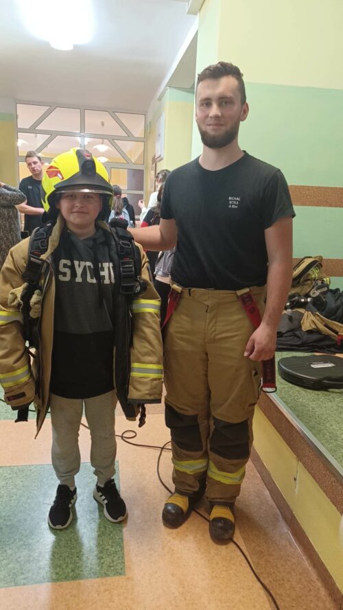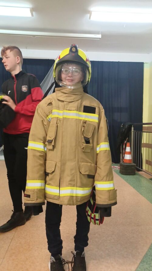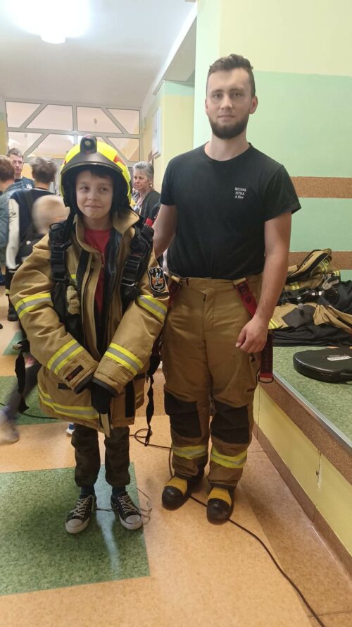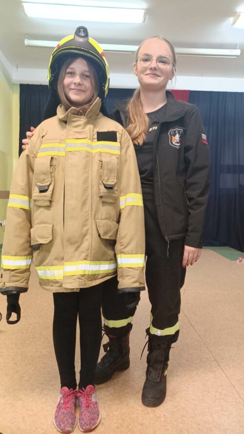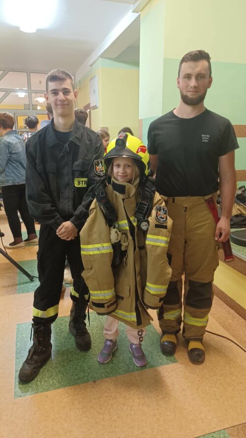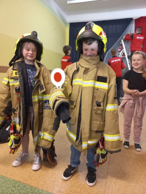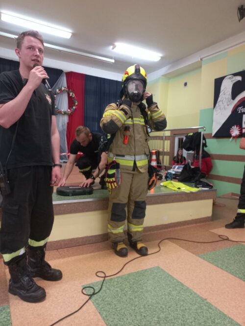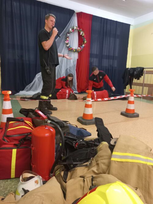 Druhowie Strażacy zapoznali uczniów z umundurowaniem strażaka, który przystępuje do akcji gaszenia pożaru, zachowaniem się w momencie dostrzeżenia sytuacji zagrażającej życiu i zdrowiu ludzi lub zwierząt, postępowaniem w miejscu prowadzenia działań ratowniczych. Dodatkowym, cennym elementem spotkania był pokaz udzielania pierwszej pomocy, wykonania RKO z udziałem Młodzieżowej Drużyny Pożarniczej.