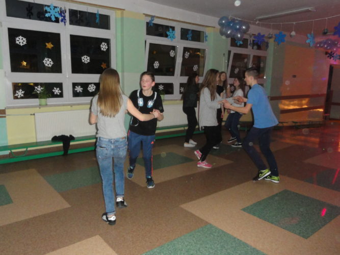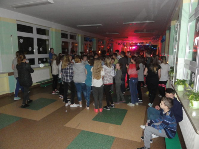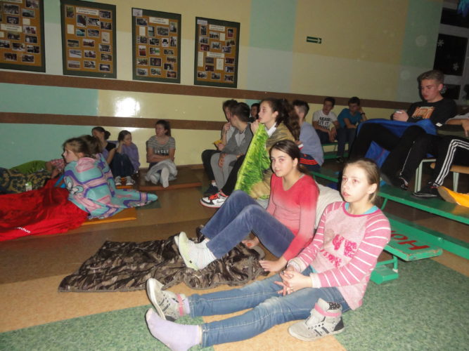 Kiedy wszystkie grupy były już w szkole udaliśmy się na kolację – przygotowane przez rodziców naleśniki. Po posiłku uczniowie wzięli udział w drugiej części zabawy, czyli konkursie wiedzy o bajkach. Po zsumowaniu punktów zdobytych „na trasie” okazało się, że słodkie nagrody zdobyli uczniowie z klas 6b i 2B zaś konkurs o bajkach wygrali uczniowie z 2A. Potem odbyła się dyskoteka, zaś późnym wieczorem seans filmowy.