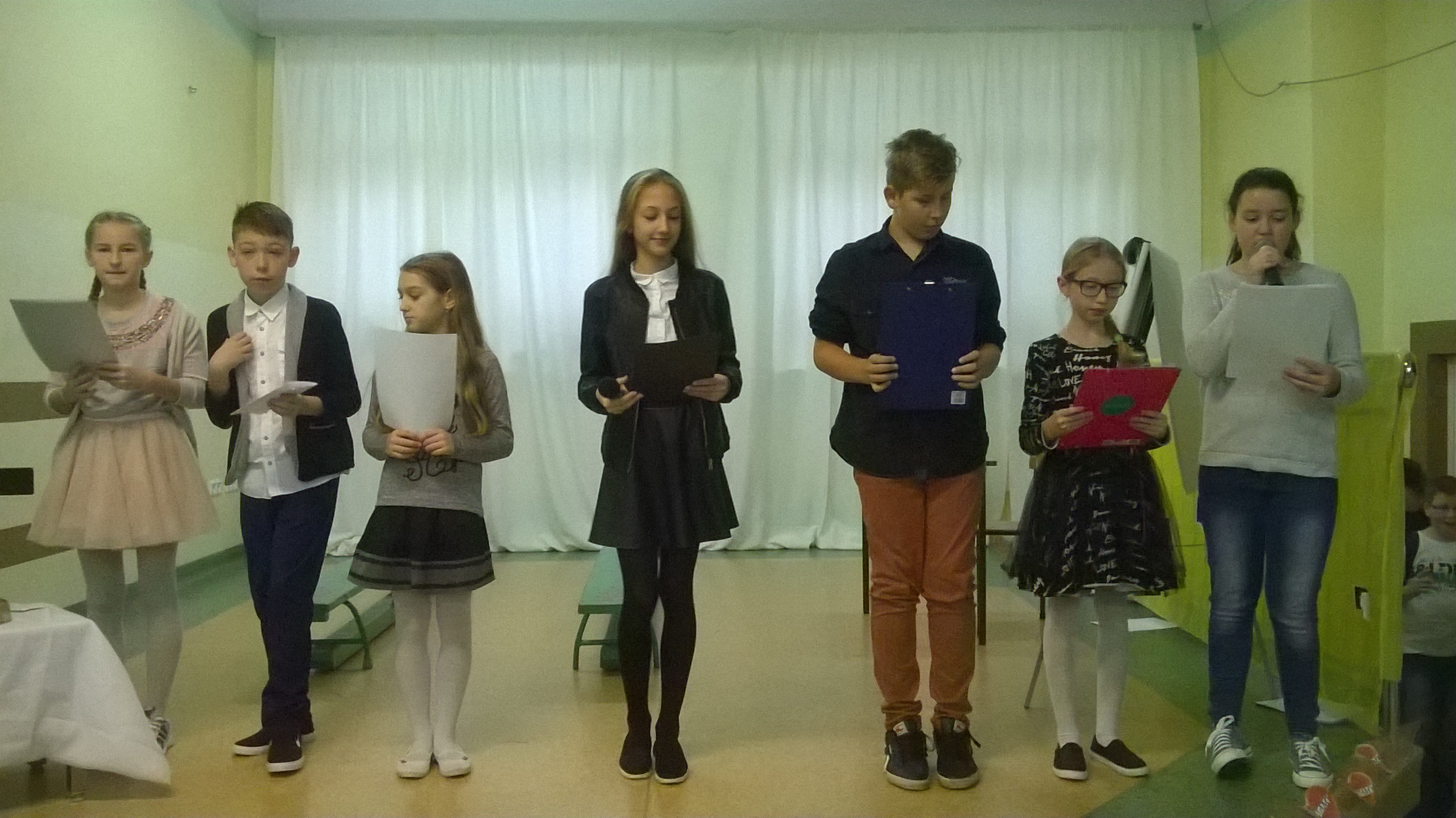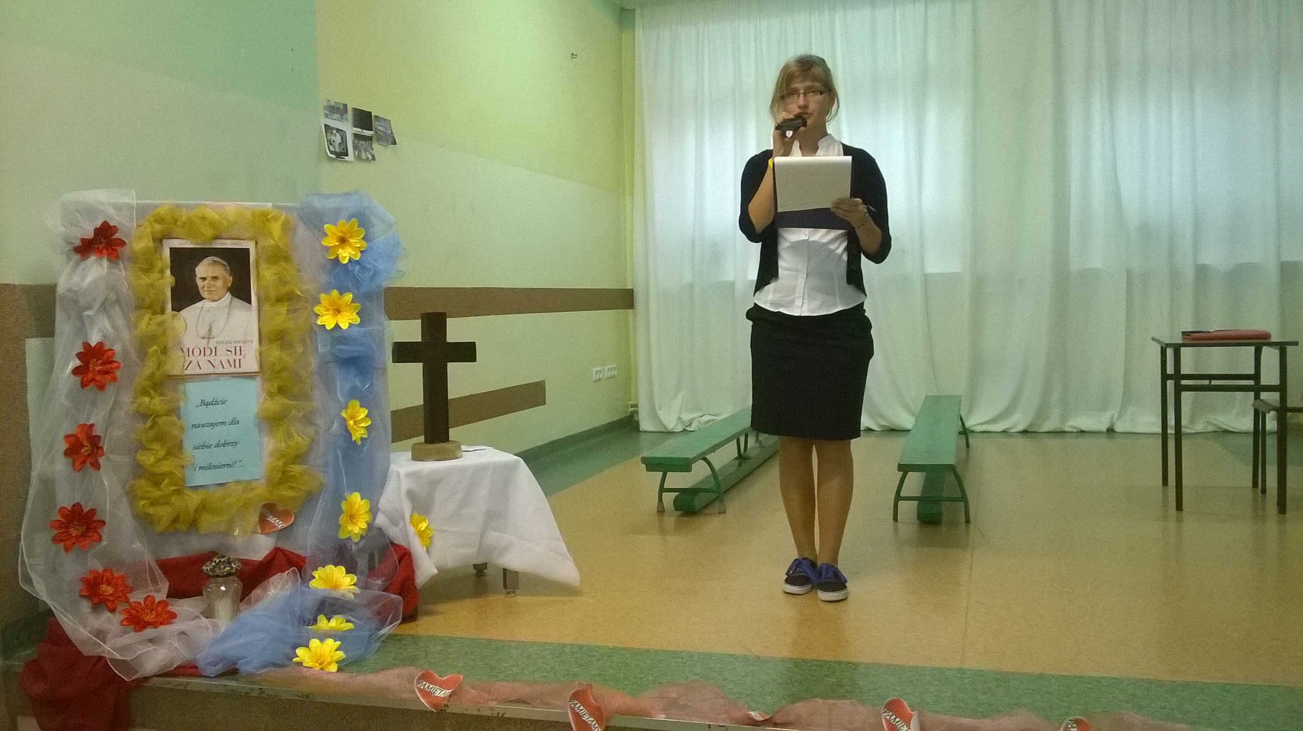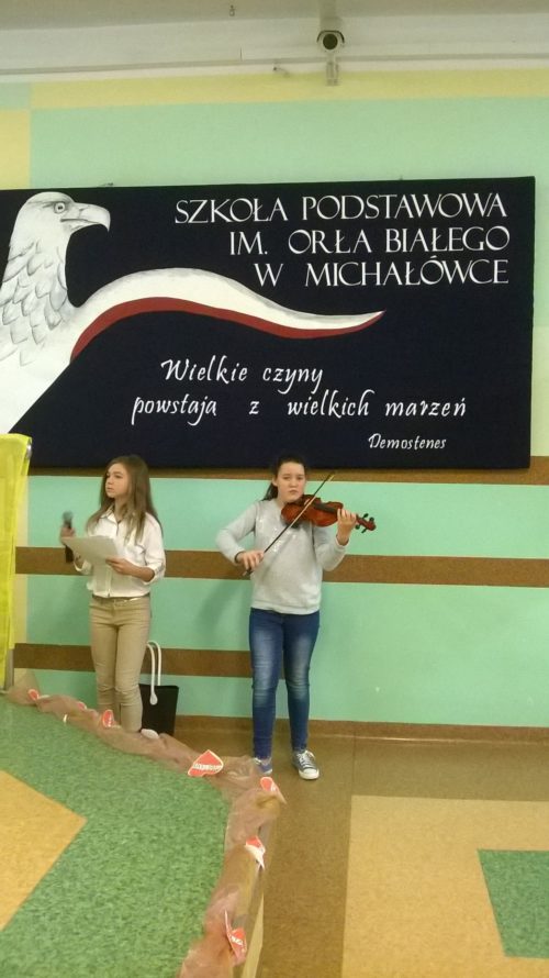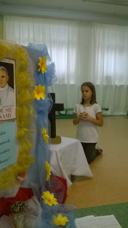 W Kościele Katolickim listopad to czas wspomnień dawnych i współczesnych świętych. Szczególnie tych ,którzy za życia byli przykładami do naśladowania i orędownikami Boga. W sposób szczególny wspominamy naszego Rodaka Jana Pawła II. „Bądźcie świadkami miłosierdzia”- to hasło przewodnie XVI Dnia Papieskiego, które nawiązuje do kościelnego Roku Miłosierdzia ogłoszonego przez Papieża Franciszka. Jednym z głównych wymiarów pontyfikatu św. Jana Pawła II było ukazanie światu Boga bogatego w miłosierdzie. Te obchody mają skłaniać nas wszystkich do tego ,abyśmy to miłosierdzie nieśli drugiemu człowiekowi. Dlatego nasi uczniowie klasy VB dnia 7 listopada 2016r. w świetle Jego nauki przygotowali przedstawienie pt:,, O dziewczynce ,której Papież Jan Paweł II przywrócił nadzieję.” Wystąpienie uświetniła młoda skrzypaczka Aleksandra Przybysz, która zagrała pięknie na skrzypcach utwór stanowiący oprawę muzyczną dla recytowanych wierszy.