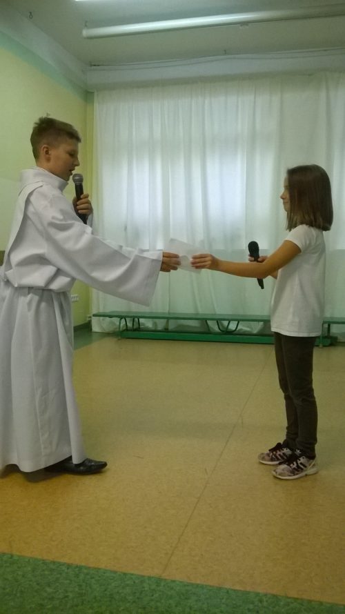 Po przedstawieniu zabrała głos Pani Dyrektor Agnieszka Szczypek skłaniając uczniów do refleksji i próby odpowiedzi na pytania o nasze czyny. Następnie podziękowała organizatorom : uczniom klasy VB oraz pani Agnieszce Zawadce .Potem zostały wręczone nagrody i dyplomy uczestnikom konkursu ,,Najładniejszy Różaniec”.