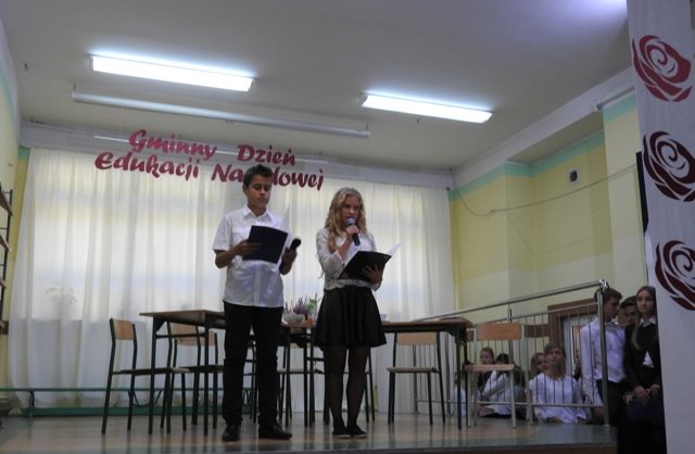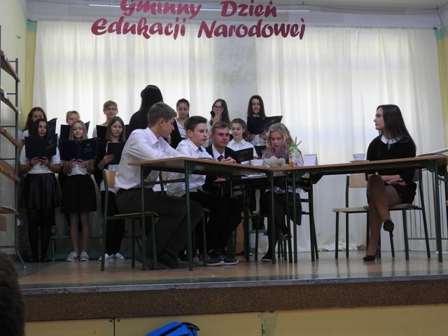 Przedstawienie przygotowali uczniowie klas gimnazjalnych pod kierunkiem pań Małgorzaty Gałązki i Niny Borkowskiej . Młodzi artyści piosenka i słowem uświetnili ten wyjątkowy dzień w roku szkolnym. Wiele ciepłych i miłych słów popłynęło w kierunku naszych nauczycieli. Uczniowie docenili i podkreślili swoją wdzięczność za codzienny trud pracy nauczyciela, jego poświęcenie, czujność i troskę o dobro wychowanków. Każdy