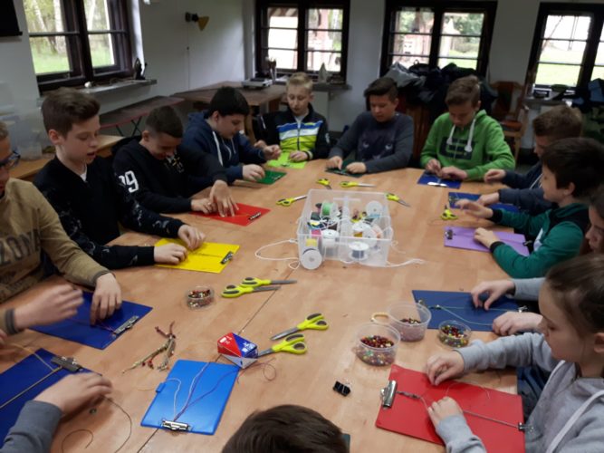 Podczas kolejnych zajęć  uczniowie poznali sposoby wyplatania makramy jako biżuterii i oryginalnych breloczków. Wszyscy chętnie uczyli się podstawowych splotów, aby wykonać nietypowy upominek dla bliskiej osoby.