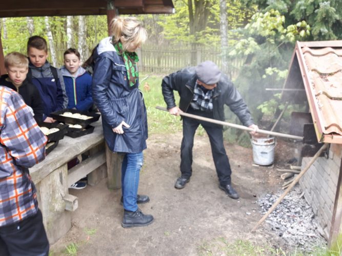 Uczniowie mieli  również okazję poznać dawne sposoby pieczenia pieczywa. Wszyscy przystąpili do tworzenia wypieków w postaci bułeczek. Odmierzali porcje, łączyli składniki, mieszali a następnie formowali kształty swoich własnych wypieków. Własnoręcznie wykonane bułki zostały upieczone w prawdziwym piecu i wszystkim bardzo smakowały.