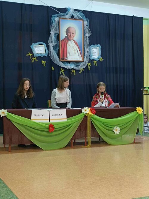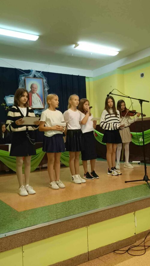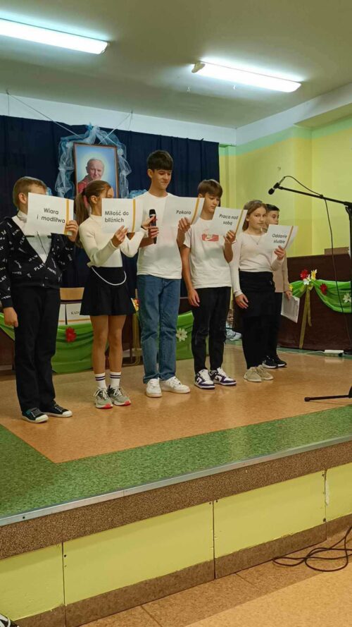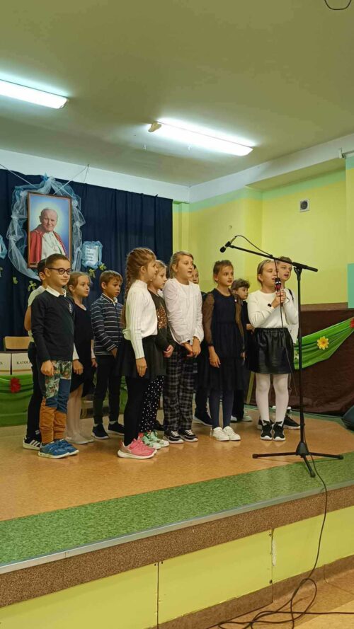 Z tej okazji 25.10.2023r. chętni uczniowie klas I-VI naszej szkoły pod kierunkiem nauczyciela religii Agnieszki Zawadki przygotowali przedstawienie artystyczne, a w nim zaprezentowali kilka scen z życia Papieża, które zdarzyły się naprawdę. Przedstawienie uświetnił występ muzyczny młodszych uczniów z klas trzecich i Zofii Grzegrzółki z klasy VI B, która zagrała na skrzypcach ulubiony utwór Ojca Świętego. Ten dzień był wdzięcznością i łącznością duchową z Ojcem Świętym Janem Pawłem II oraz Jego nauczaniem.